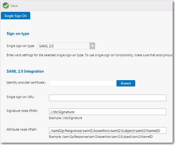 9. In the Signature node XPath field, the default setting is //ds:Signature. Adjust this signature node XPath as needed, per your identity provider platform.