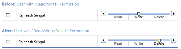 On each of the tabs of the Admin Security view, adjust the user or group’s assigned rights for that role by sliding the indicator to select the desired rights, as shown in the following example: