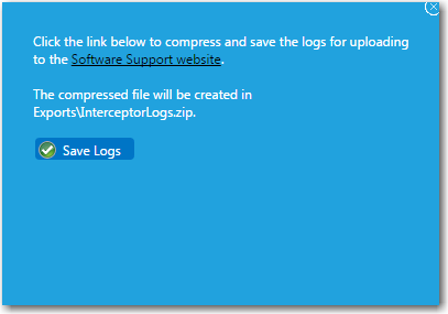 To save the log files in a ZIP file, so that it could perhaps be sent to product support personnel, click Save Logs. You are prompted to confirm the creation of a ZIP file which will contain a set of
