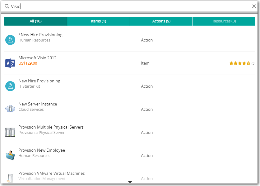 2. Search for the published services (catalog items) by entering text in the Search text box. A list of search results appears in a pop-up dialog box: