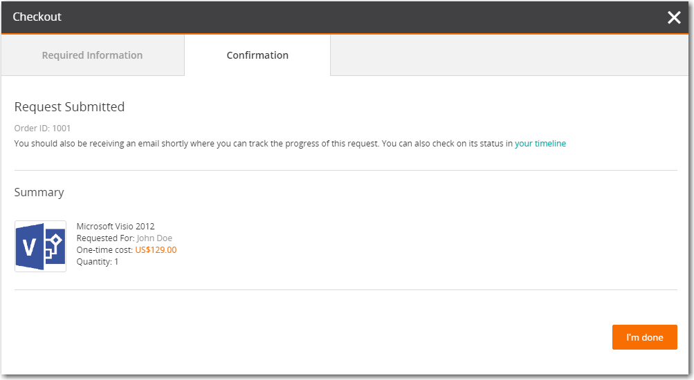 5. Enter the Machine Name and click on the Complete request button. The Confirmation tab of the Checkout process opens and the Request Submitted message is displayed.