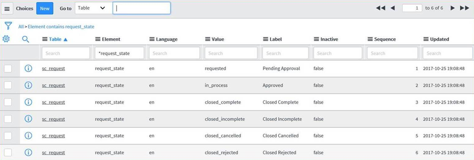 2. Use the Element column filter to filter down to request_state to display the valid choices in the Value column that map to the desired statuses in App Portal / App Broker.