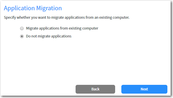 12. If you want to migrate applications from an existing computer to the target computer, select the Migrate applications from existing computer option. If you select this option, the Select computer field is displayed, where you are prompted to search for the existing computer.