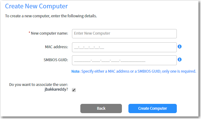 7. Enter either the MAC address or SMBIOS GUID of the new computer. Only one value is required.