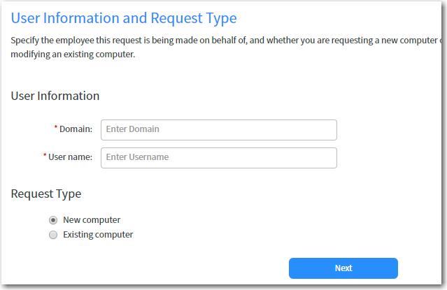 1. Click on Employee App Provision Request in the ServiceNow menu. The User Information and Request Type panel of the wizard opens.
