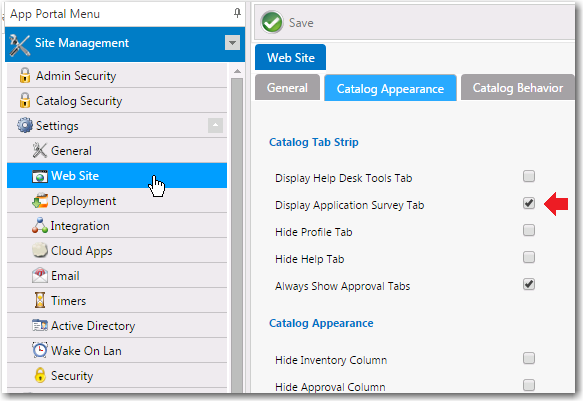 Under Catalog Tab Strip, select Display Application Survey Tab.