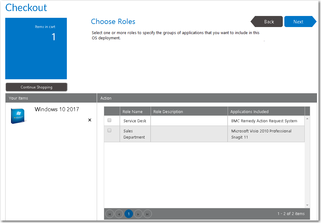 1. On the Browse Catalog tab, locate an OS deployment task sequence catalog item for the operating system you desire, and click Add to add it to your cart. The Choose Target panel of the Checkout Wizard opens.