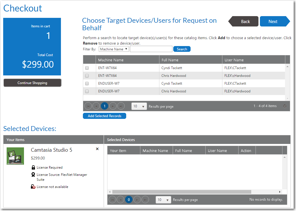 On the Choose Target panel of the Checkout Wizard, select Search for people or computers, as described in Choosing a Target or Target Option, and click Next. The Choose Target /Users for Request On Behalf Panel panel opens.