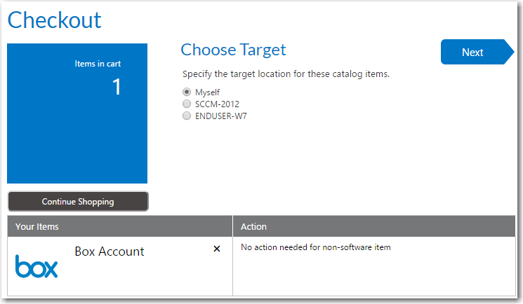 4. Click View cart and checkout. The Choose Target panel of the Checkout Wizard opens.