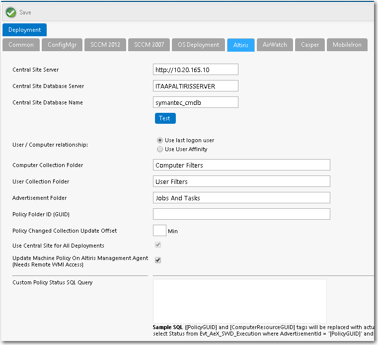 3. In the Central Site Server field, enter the machine name of the Altiris Notification Server.