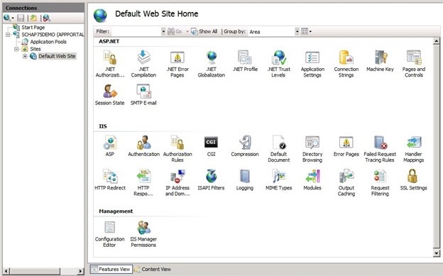Select Default Web Site in the tree. The Default Web Site Home view opens.