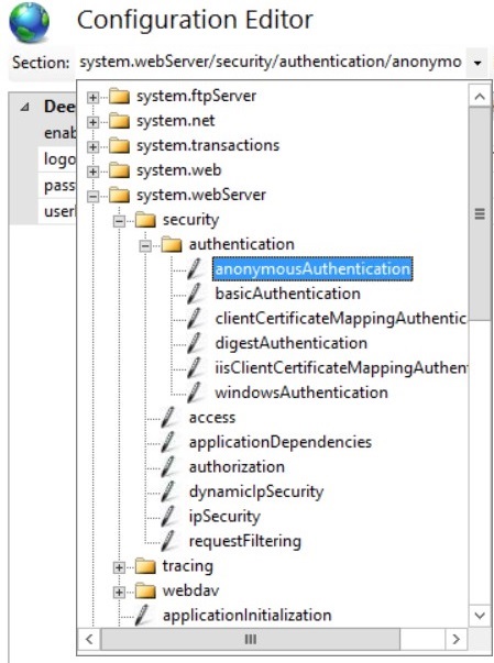 From the Section list, expand the tree and select windowsAuthentication (which is under system.webServer > security > authentication).