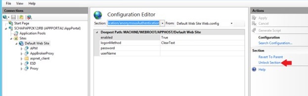 In Windows Server, you need to unlock the anonymousAuthentication section for the Default Web Site in IIS to allow web applications to use Single Sign-On Authentication, which is a requirement of App Portal / App Broker, when Microsoft Entra ID / Active Directory is used as IAM.